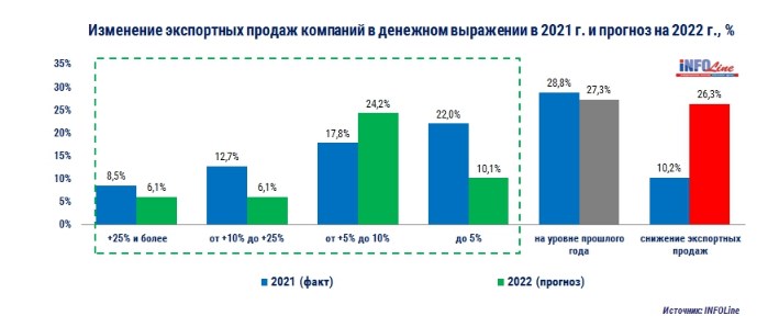 Напомним, что два года подряд (2020 и 2021) в современной истории РФ экспорт продовольствия превышал импорт: в 2021 году положительное сальдо торгового баланса составило 2,8 млрд долл. США (в 2020 г. – 1 млрд долл. США). Согласно опросу INFOLine, в 2021 году около 61% опрошенных российских поставщиков отметили рост продаж на экспорт.